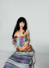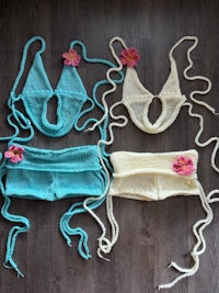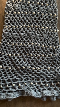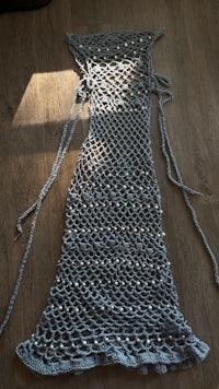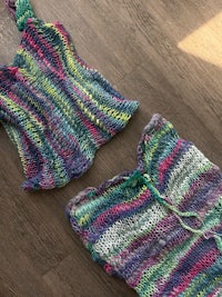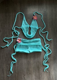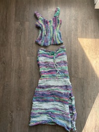 shorts are XS-M, sweater fits up to XL. knit with crochet details + buttons